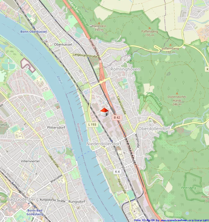 Unmittelbar an der Ortsgrenze zu Bonn-Oberkassel, direkte Autobahnanbindung zur B42. Öffentliche Verkehrsmittel sind fußläufig erreichbar.
