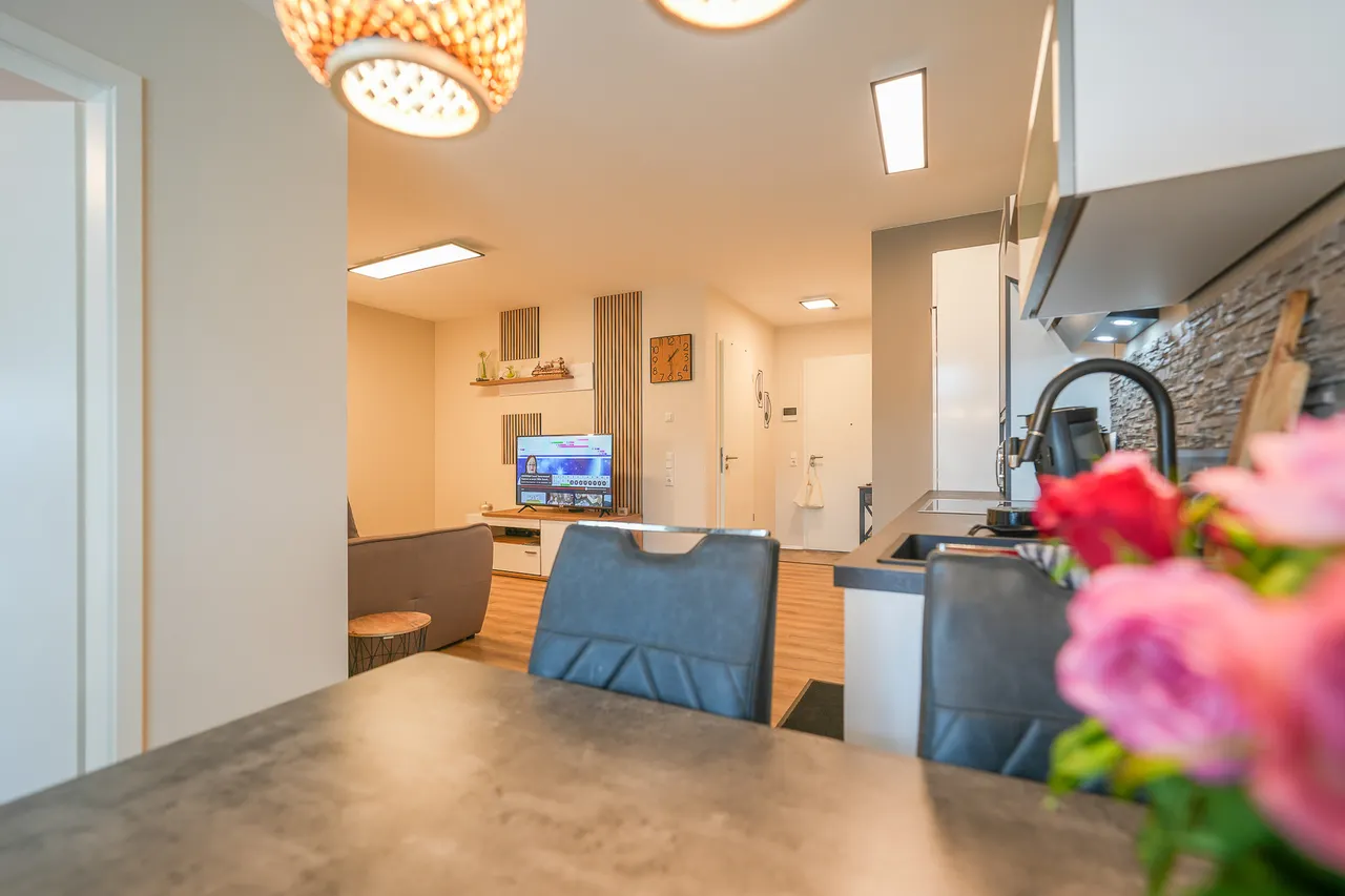 Besonders hervorzuheben ist der barrierearme Zugang der gesamten Wohnung. Alle Räume sind ohne Stufen erreichbar, was höchsten Wohnkomfort garantiert. Als Effizienzhaus 40+ bietet die Wohnung eine nachhaltige und energieeffiziente Bauweise. Die Photovoltaikanlage versorgt sowohl die Heizung als auch die Wallboxen für Elektrofahrzeuge mit umweltfreundlicher Energie. Eine Luftwärmepumpe und eine Lüftungsanlage sorgen zusätzlich für ein optimales Raumklima und eine nachhaltige Energieversorgung.