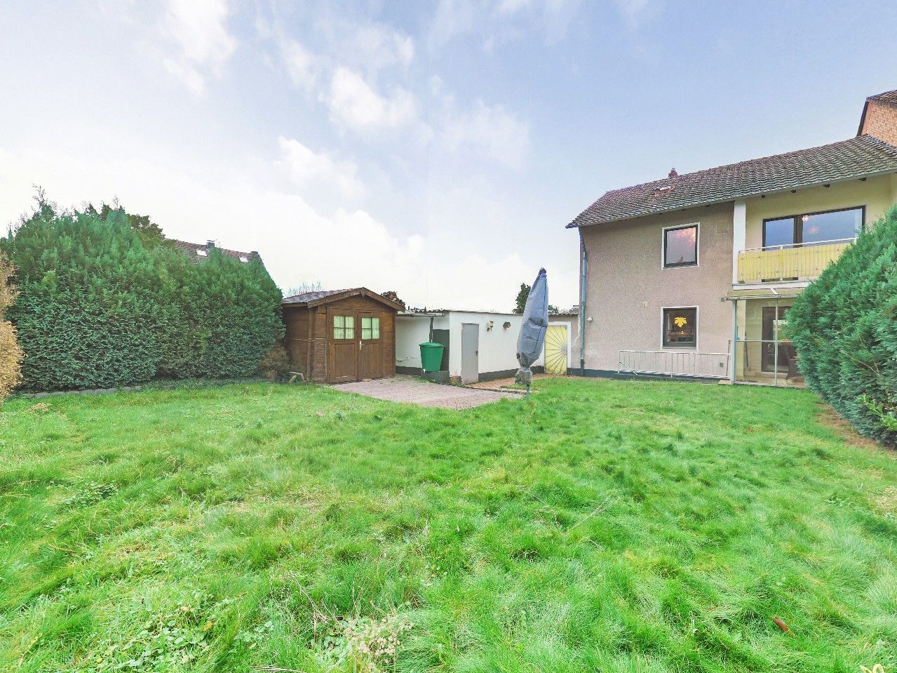 Der Garten ist überwiegend mit Rasenflächen und liebevoll angelegten Sträuchern gestaltet und lädt zum Entspannen und Verweilen ein. Hier finden Sie einen idealen Rückzugsort, um nach einem langen Arbeitstag zur Ruhe zu kommen.