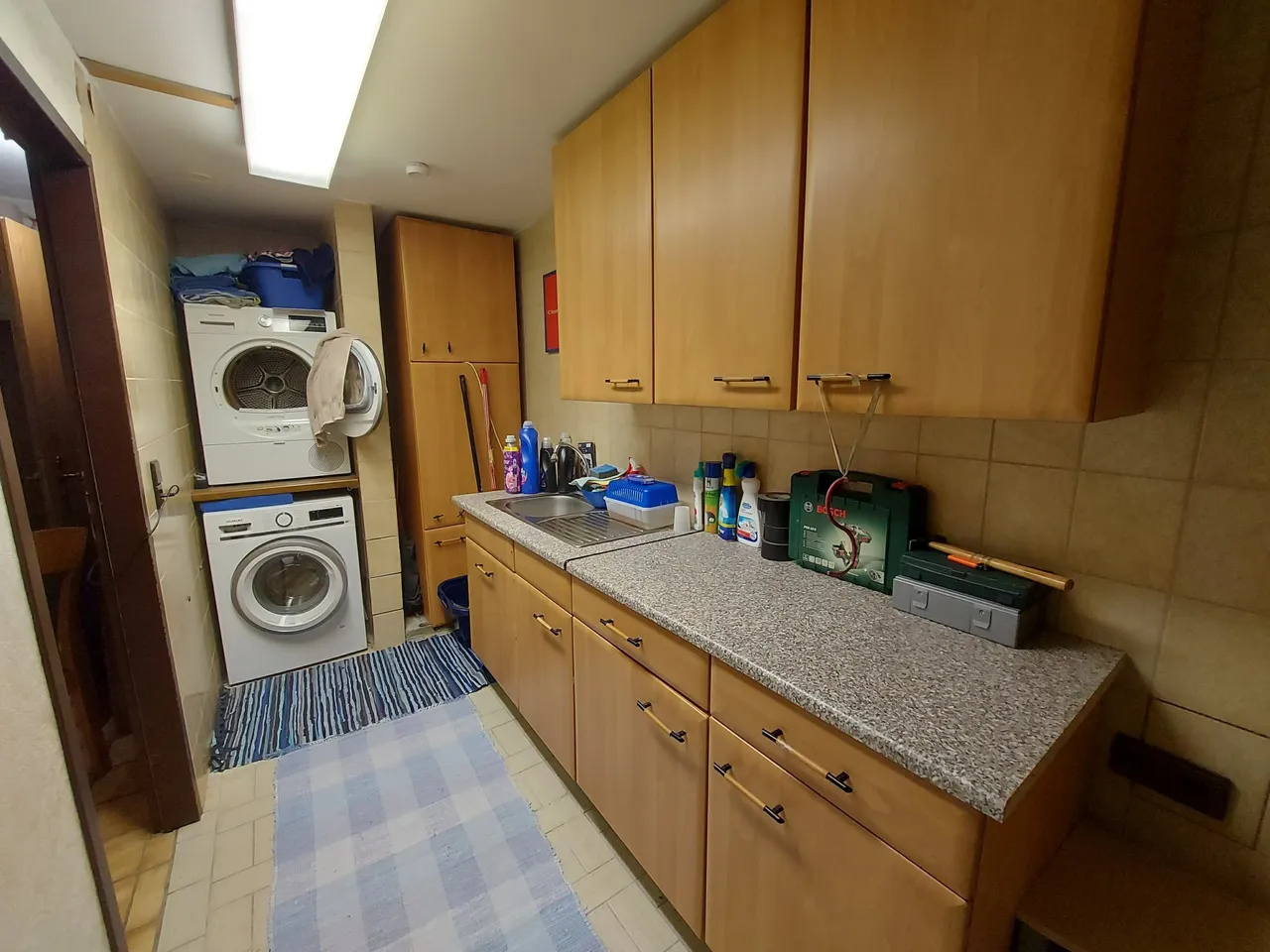 Im Erdgeschoss empfängt Sie ein einladender Eingangsbereich, der mit Fliesenboden, einem praktischen Einbauschrank, weiß lackierten Wandpaneelen und einer stilvollen dunklen Holzdecke gestaltet ist. Das helle Gäste-WC profitiert von natürlichem Tageslicht. Die moderne Küche, die sich in unmittelbarer Nähe zum Wohnbereich befindet, ist funktional und einladend. Das lichtdurchflutete Wohnzimmer, ausgestattet mit einer großen Glasfront zur Terrasse und grauem Vinylboden, verfügt über einen gemütlichen Kachelofen, der für eine angenehme Atmosphäre sorgt.