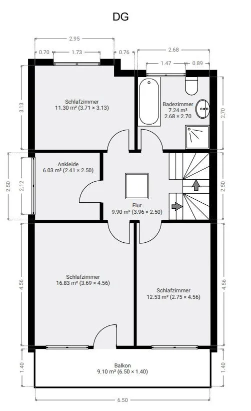Im Obergeschoss setzt sich das harmonische Gestaltungskonzept mit Holzelementen fort. Alle Wohnräume sind mit Teppichböden ausgelegt. Das Badezimmer ist funktional gestaltet und bietet eine Badewanne, Dusche, WC, Waschbecken, ein Fenster und Spotbeleuchtung. Vom Elternschlafzimmer hat man Zugang zum Balkon. Es gibt drei weitere Schlafzimmer und ein Ankleidezimmer im Dachgeschoss.