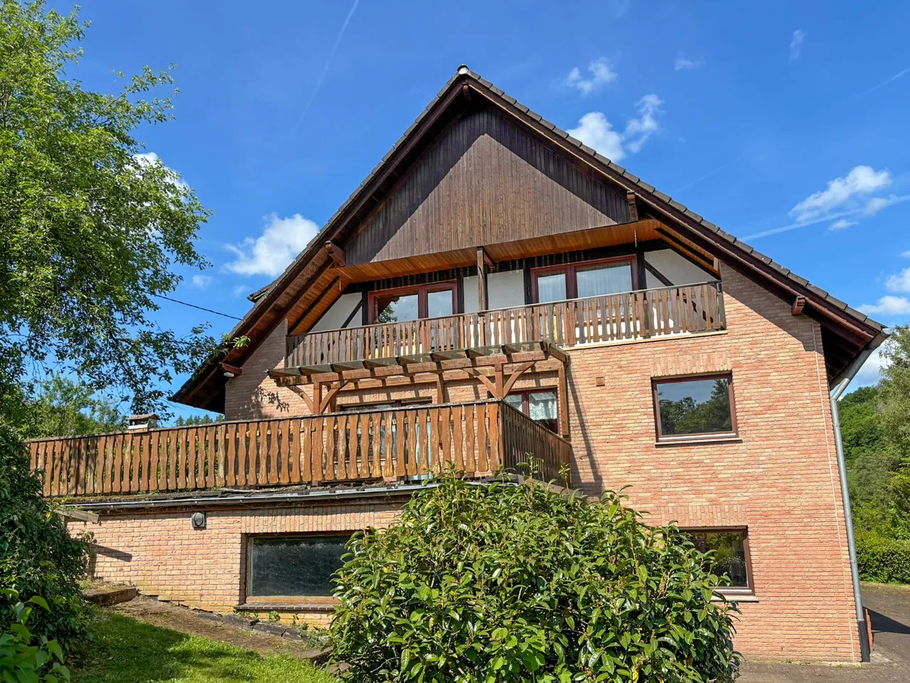Das Haus ist in zwei Wohneinheiten unterteilt und wird über einen zentralen Eingang im Souterrain erschlossen. Die rechte Einheit überzeugt mit einem hellen Wohn- und Essbereich, Wintergarten und Blick in den Garten. Im Dachgeschoss stehen fünf Schlafzimmer sowie ein Badezimmer zur Verfügung. Die linke Einheit bietet einen großzügigen Wohnbereich mit Terrassenzugang, eine separate Küche sowie ein Schlafzimmer mit Balkon im Obergeschoss. Im Untergeschoss befinden sich neben Vorrats- und Hauswirtschaftsräumen zwei integrierte Garagen mit direktem Hauszugang. Ein Wellnessbereich mit Sauna sorgt für zusätzlichen Wohnkomfort. Das Angebot wird durch enthaltenes Bauland ergänzt.