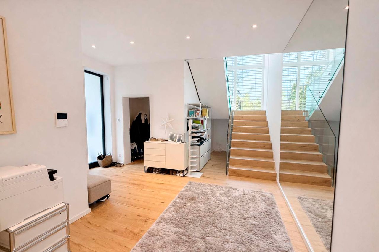Der offen gestaltete Wohn- und Essbereich mit bodentiefen Fensterflächen schafft ein elegantes und zugleich behagliches Ambiente. Edles Kährs-Parkett, italienische Fiandre-Fliesen in Studio und Nasszellen sowie eine stilvolle Innen- und Außenbeleuchtung von Bega unterstreichen den gehobenen Anspruch. Die maßgefertigte Küche mit Miele-Geräten, Bora-Kochfeld und Quooker-System wird durch eine hochwertige Garderobe und Ankleide von Steeg Wohnconcept ergänzt.