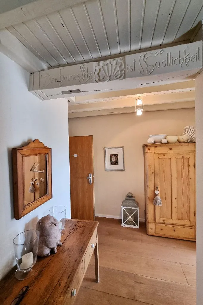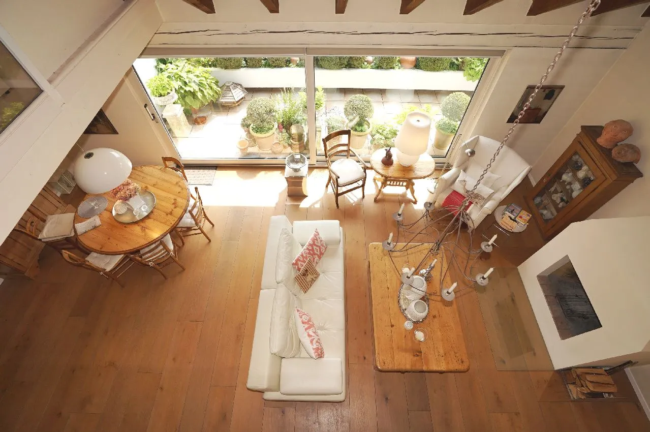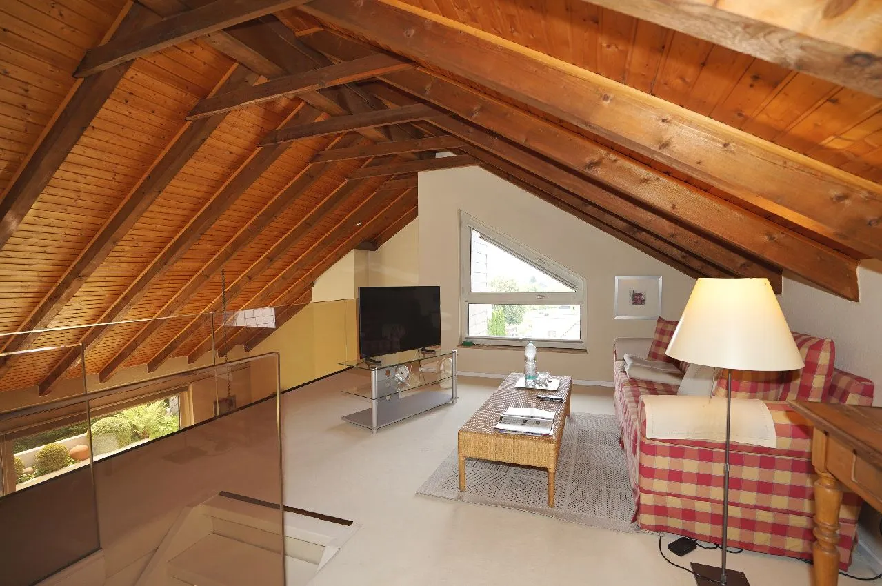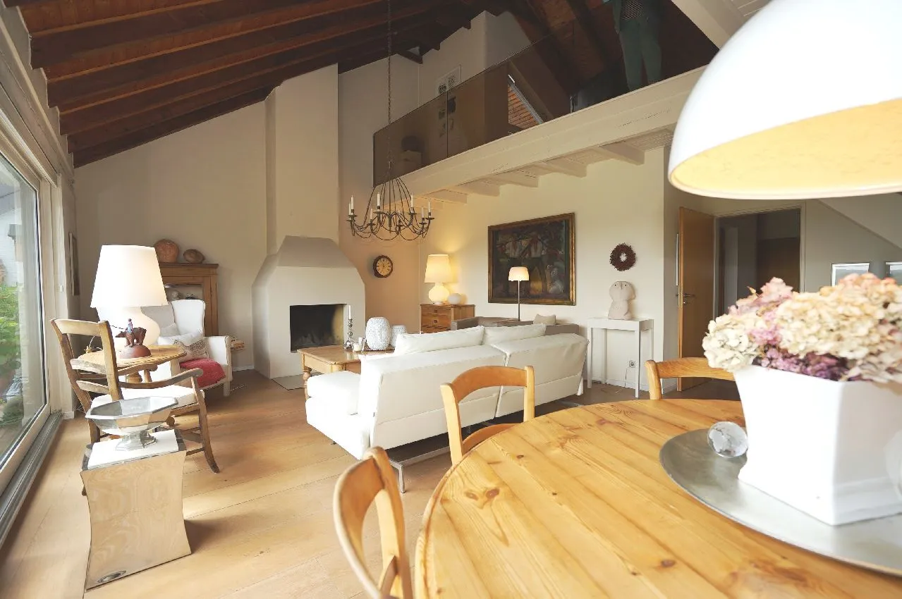 Schon im Eingangsbereich der ca. 103 m² großen Wohnebene erkennt man die besondere Gestaltung und Ausstattung der Einheit, die eine angenehme und edle Gemütlichkeit ausstrahlt. Die Küche befindet sich direkt dem Eingang gegenüberliegend, und zur Rechten öffnet sich der Grundriss in den geräumigen Wohn- und Essbereich mit dem auf der Giebelseite zentral gelegenen offenen Kamin. Die Wohnung ist mit dem Wohnzimmer, der Küche und dem Balkon zur Gartenseite ausgerichtet, die den herrlichen Blick in die Natur zulässt. Die Großzügigkeit wird durch den großen Luftraum oberhalb des Wohnzimmers noch verstärkt, und mündet in einer ca. 27 m² großen, offen und wohnlich ausgebauten Galerie mit Fernsehbereich, Arbeitsplatz und Gäste-Duschbad. Die Kombination aus massivem Dielenboden und Glasflächen ergänzt sich hervorragend.
