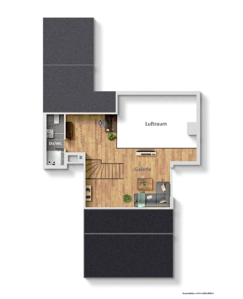 Die wohnlich ausgebaute und integrierte Galerie (Speicher) wird durch den großen Deckenausschnitt voll in das Raumkonzept integriert und ist über die breite Vollholztreppe leicht erreichbar. Sie bietet als multifunktionale Ebene bedarfsgerechten Nutzungen Raum. Aktuell sind hier ein Arbeits- sowie ein TV-Bereich untergebracht, die durch ein Duschbad ergänzt werden. In den Abseiten des Daches wurden praktische Abstellbereiche vorgesehen. Neben der Belichtung durch die Schiebetüranlage bieten zwei Fenster auf der Galerie sehr gute Belichtungs- und Belüftungsmöglichkeiten. Auch im Duschbad ist ein Dachflächenfenster vorhanden.