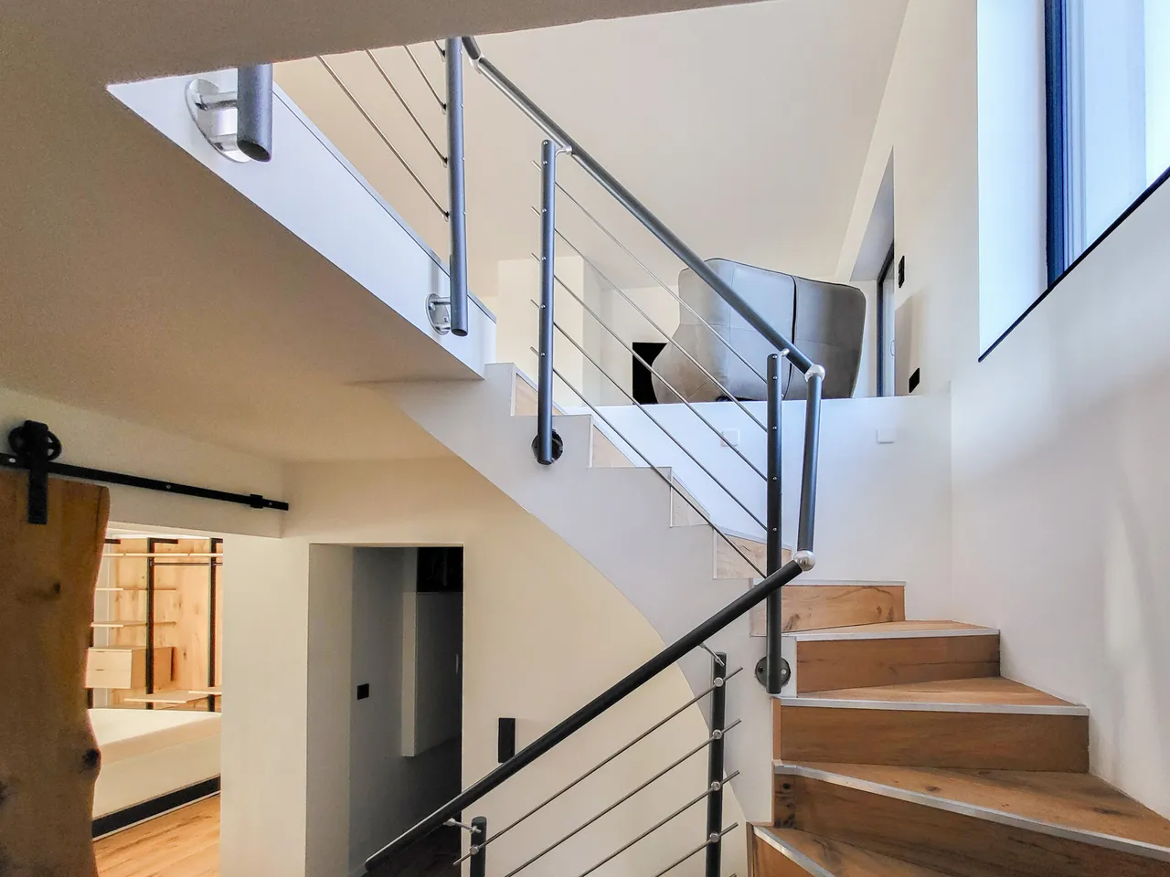 Über das offen gestaltete Treppenhaus gelangen Sie in das Obergeschoss. Hier erwartet Sie auf ca. 60 m² ein beeindruckender Koch-, Wohn- und Essbereich. Besonderes Highlight ist die große Kochinsel, die zum Kochen und Verweilen einlädt. Zusätzlich steht Ihnen ein separater Nebenraum zur Verfügung, der derzeit als zweite Küche genutzt wird und weitere Arbeits- sowie Abstellflächen für Küchengeräte bietet.