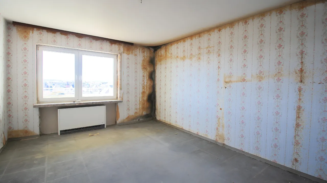 Infolge eines früheren Dachschadens drang zeitweise Feuchtigkeit in die Wohnung ein. Die Ursache wurde inzwischen behoben, dennoch besteht ein umfassender Sanierungsbedarf, der bei der weitern Planung berücksichtigt werden sollte.