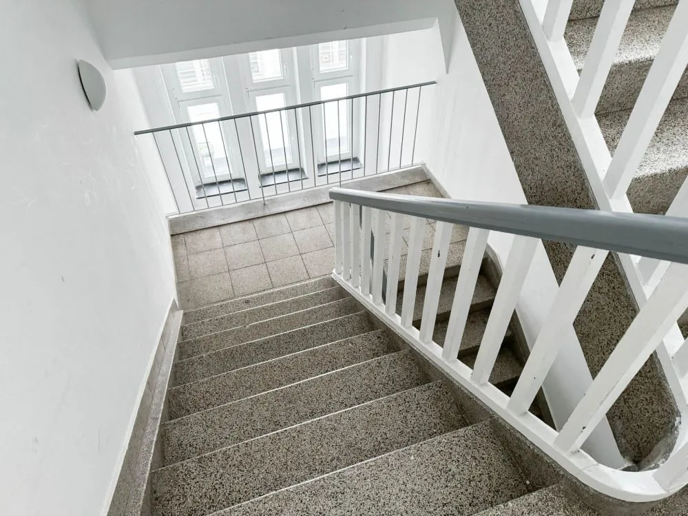 Gepfelgt mit massiver Treppenanlage aus Beton sowie Holzgeländer.