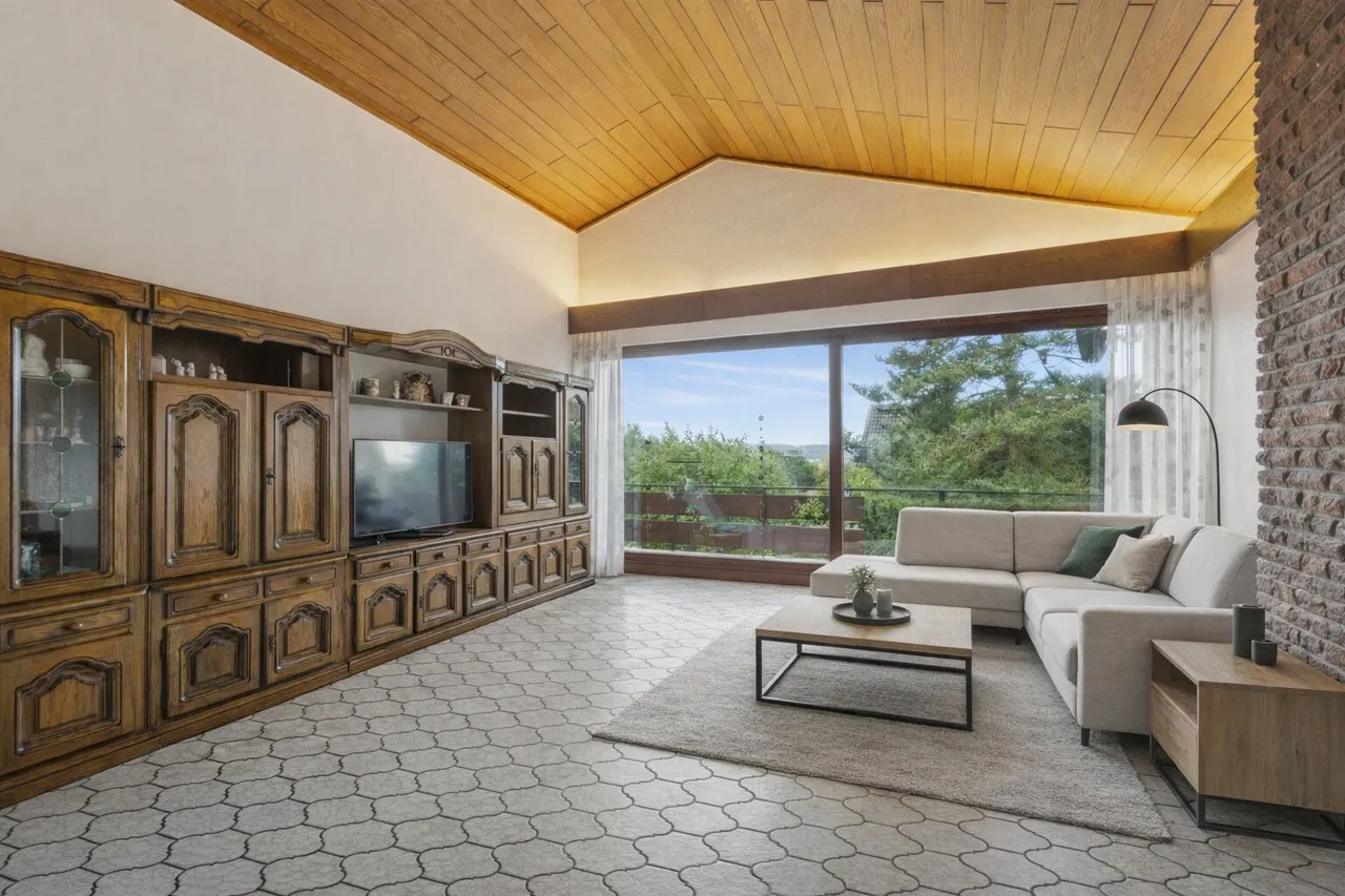 Beim Betreten des Erdgeschosses gelangt man über die Diele direkt in den offen gestalteten Wohn-, Küchen- und Essbereich, der dank hellen Fliesen und bodentiefer Fenster von Licht durchflutet wird und einen herrlichen Ausblick eröffnet. Die Holzbalken und Holzverkleideten Decken sorgen für ein Wohlfühlambiente. Im Wohnzimmer befindet sich außerdem eine großzügige Kaminecke, welche über drei Stufen erreicht werden kann und durch Fenster mit elektrischen Rollläden direkten Ausblick in den Garten bietet.