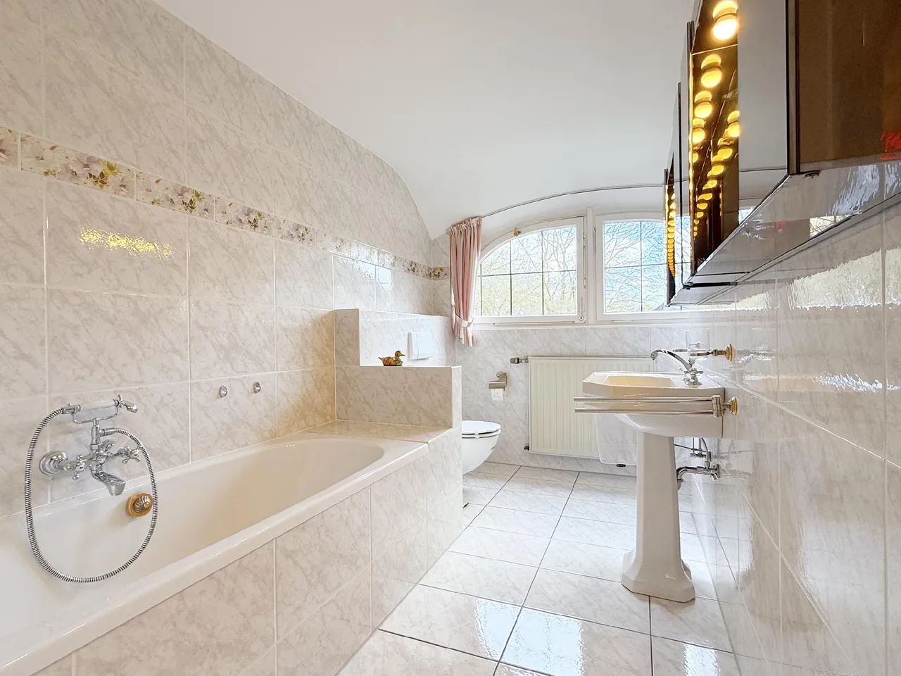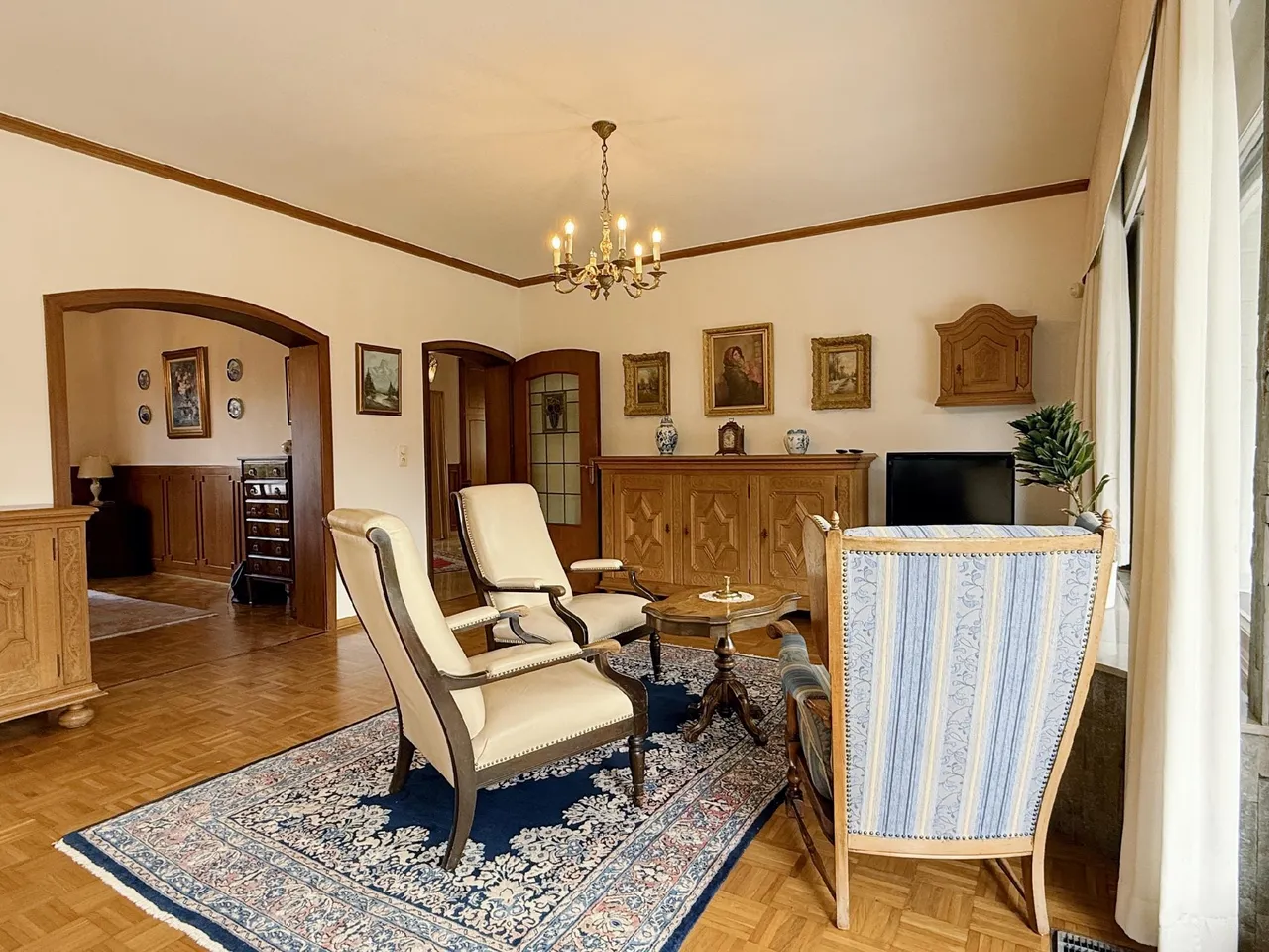 Beim Betreten der Villa befinden Sie sich in einem großzügigen, hellen Eingangsbereich. Eine gewendelte Holztreppe führt Sie von hier ins erste Obergeschoss, maßangefertigte Einbauschränke bieten viel Stauraum und eine farbenfrohe Bleiverglasung bildet einen charmanten Hingucker. Der Eingangsbereich führt Sie zur Rechten in ein rund 40 m² großes Wohnzimmer mit tollem Blick in den eigenen Garten. Große Fensterfronten sowie eine Doppelflügeltür zur Terrasse lassen viel Tageslicht in den mit Stäbchenparkett ausgelegten Raum einfallen. Die südlich ausgerichtete Terrasse kann zu einem großen Teil mit einer elektrischen Markise beschattet werden. Angrenzend an den Wohnbereich befindet sich ein geräumiges Esszimmer, durch welches Sie in die Küche gelangen. Um den Grundriss des Hauses an die heutigen Wohnanforderungen anzupassen, wäre eine Verbindung der beiden Räume mittels eines Durchbruchs überlegenswert.