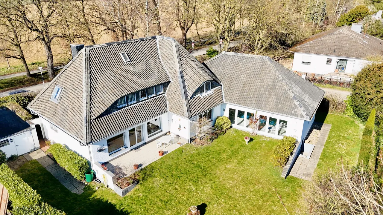 Am Rande eines ruhigen Wohngebiets mit gewachsener und gehobener Bebauung auf zum Teil sehr großzügigen Grundstücken befindet sich dieses prachtvolle Anwesen mit unmittelbarem Blick in die Natur.