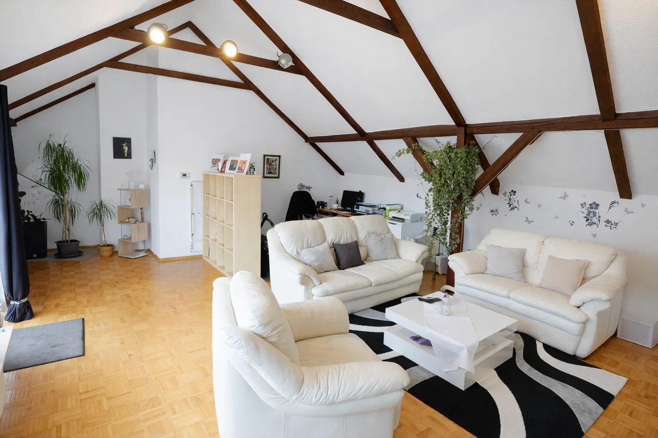 Im Obergeschoss befindet sich die Küche mit einem vorgelagerten Essbereich, der offen zur Diele gestaltet ist. Darüber hinaus stehen hier zwei Schlafzimmer sowie ein Tageslichtbad zur Verfügung. Im Dachgeschoss befindet sich das ca. 40 m² große Wohnzimmer mit Kaminofen und Zugang zu einer Dachloggia mit Süd-West-Ausrichtung sowie einem seitlichen Abstellraum.
