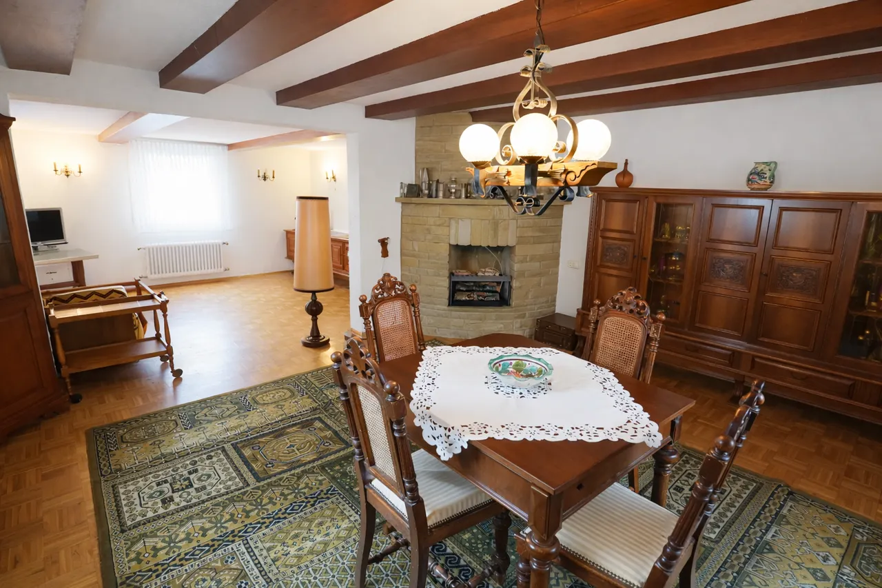 Im Erdgeschoss bietet die Wohnung eine Kochküche, ein Schlafzimmer mit Zugang in den Garten sowie einen modern offen gestalteten Wohn-/ und Essbereich mit gemauertem Eckkamin und Holzparkettfußboden.