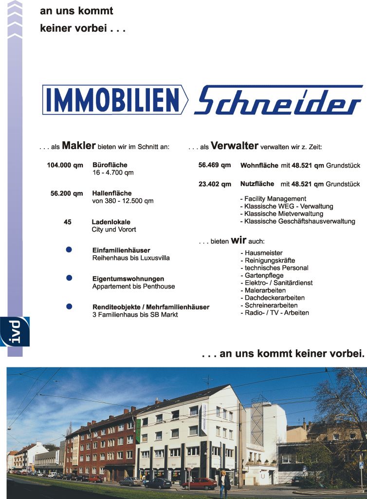 Die Firma IMMOBILIEN R.SCHNEIDER KG besteht seit 1961 und bietet Ihnen mit stolz einen professionellen Rundum-Service für das klassische Immobiliengeschäft an.